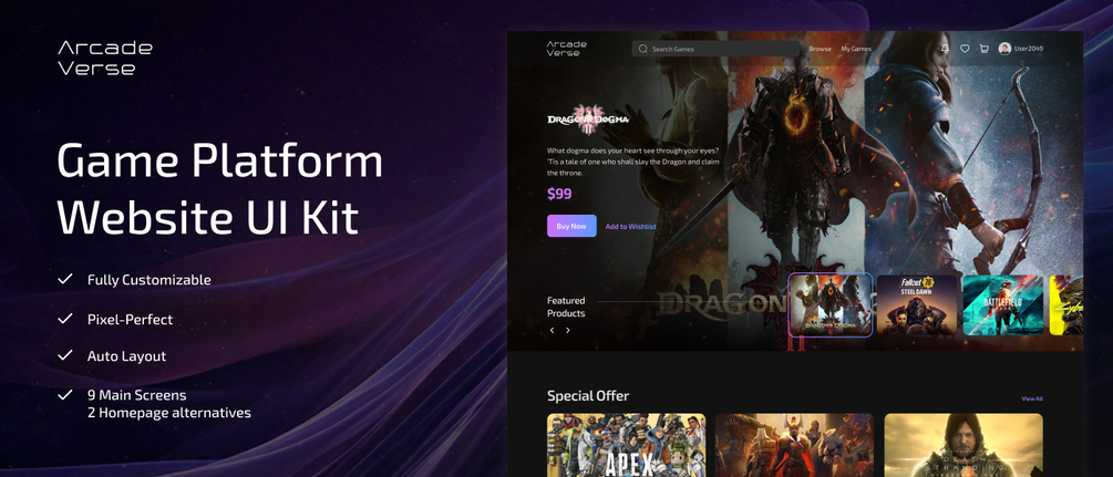 ArcadeVerse UI Kit is suitable and easy to fully customize to fits your needs. ArcadeVerse UI Kit is well-layered and organized design, pixel-perfect design, free font, supporting images, supporting components, and variants to make it easier to adjust